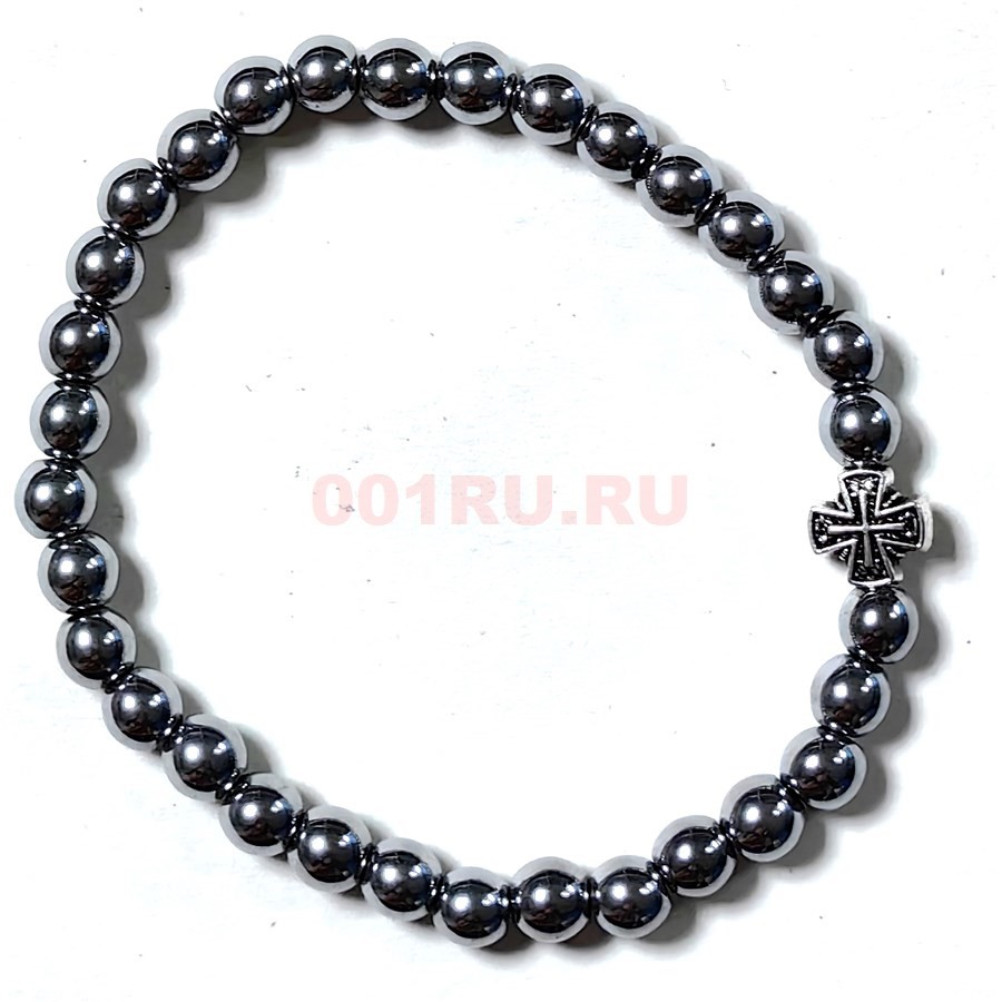 Браслет из гематита 6 мм с крестиком цвет металл