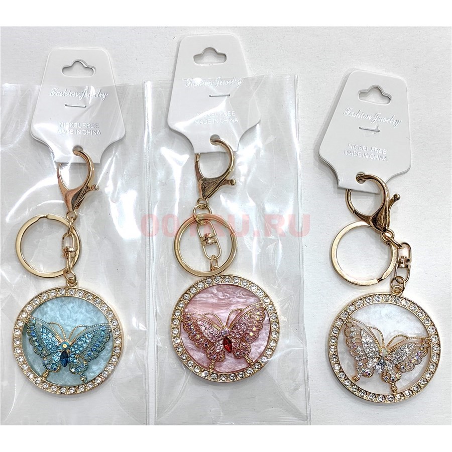 Брелок со стразами Бабочка круг (KY-2524) с карабином 12 шт/упаковка