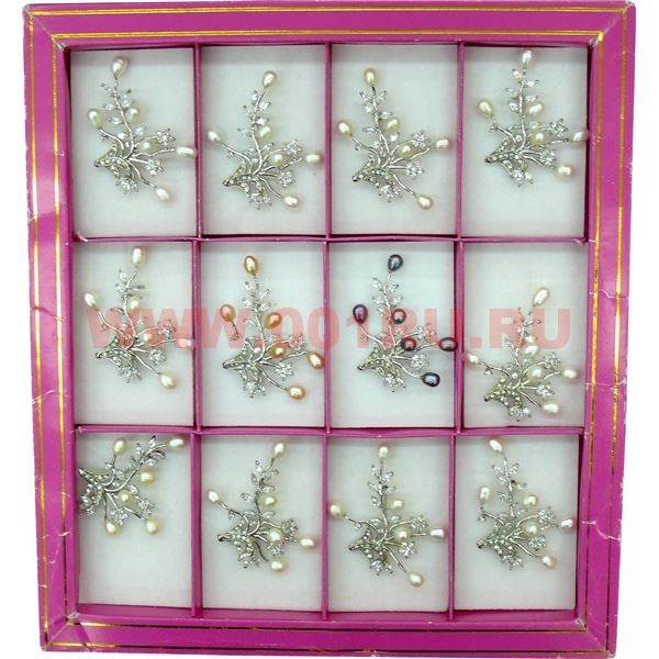 Брошь из речного жемчуга "цветы и почки" со стразами, цена за 12 штук