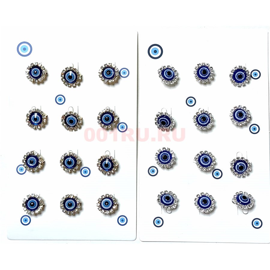 Материал: Стеклянные стразы, металлическая фурнитура, пластмассовый сглаз. Цена указана за 1 брошь. Минимальный заказ 3 упаковки.