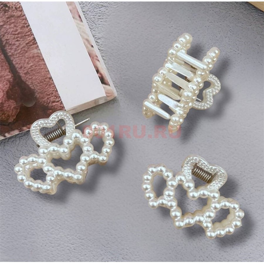 Крабики для волос 4 см под жемчуг (форма 3 сердечка) пластмассовые 120 шт/упаковка