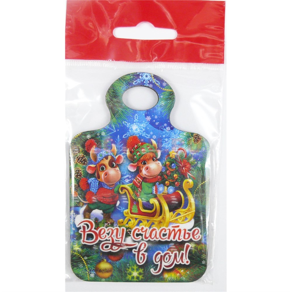 Магнит деревянный прямоугольный Везу счастье в дом Бык Символ 2021 года