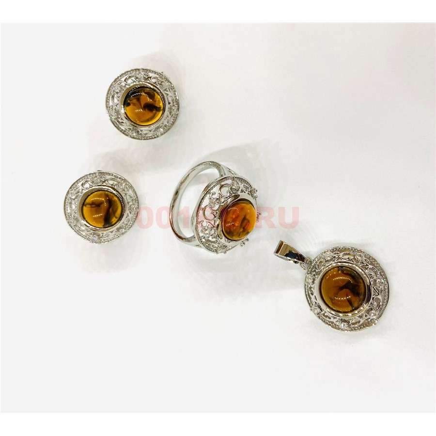 Набор 3-в-1 кольцо, серьги и подвеска из янтаря цвет металл (YA-011)