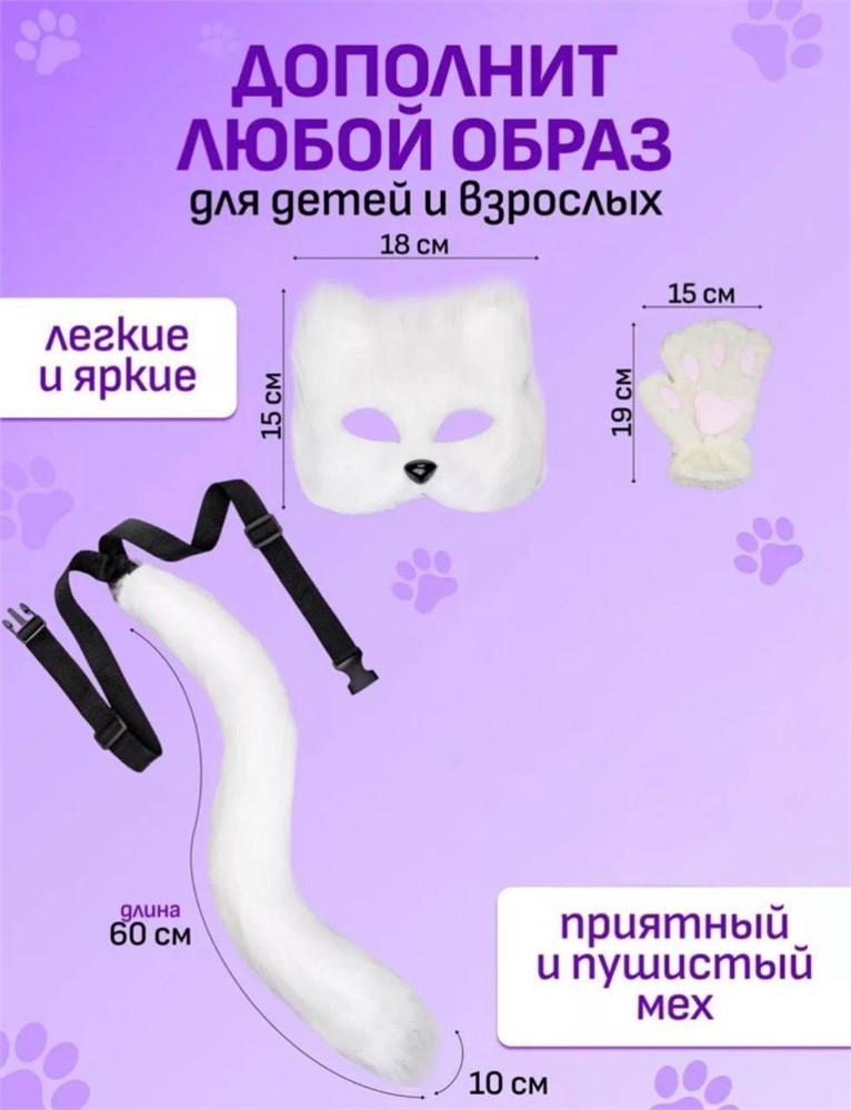 Набор кошечки белый из 3 предметов (маска, лапки, хвост)