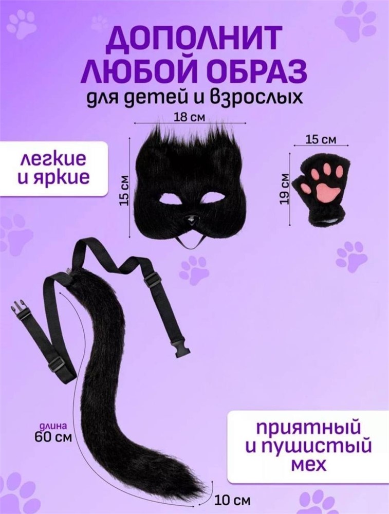 Набор кошечки черный из 3 предметов (маска, лапки, хвост)