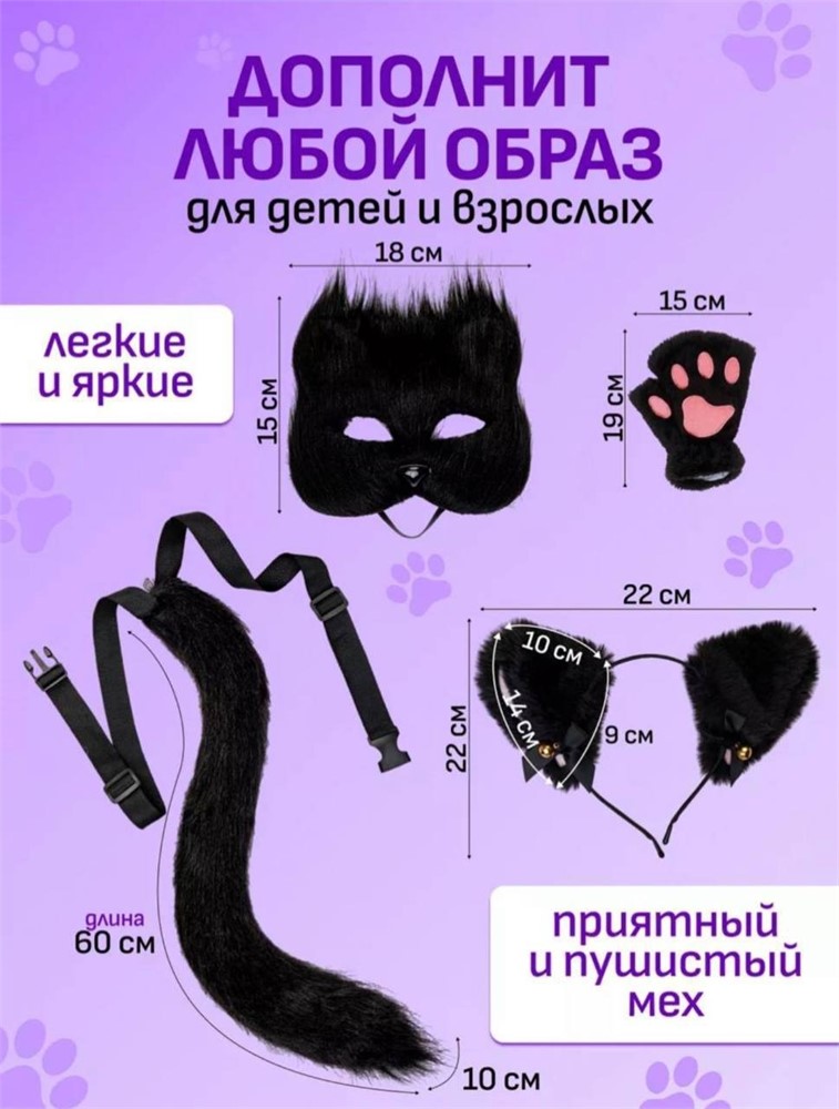 Набор кошечки черный из 4 предметов (маска, ободок ушки, хвост)