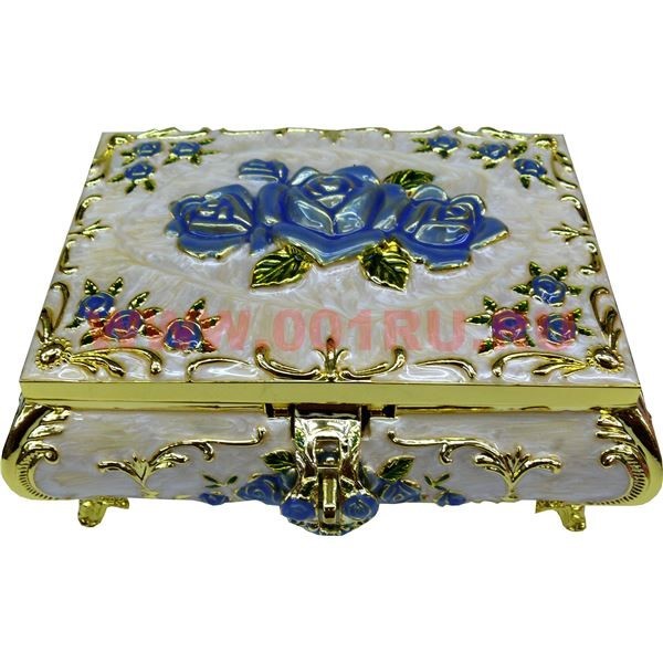 Шкатулка металлическая большая "Кремовая с голубыми розами" перламутр
